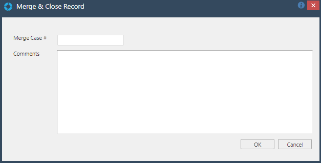 Selecting the merge icon will open the Merge & Close Record screen, this is where the number of the Record to merge with and a comment for the audit log can be entered. This will merge and close the Record that is being viewed and the audit logs of both will be reflected in each Records History tab.