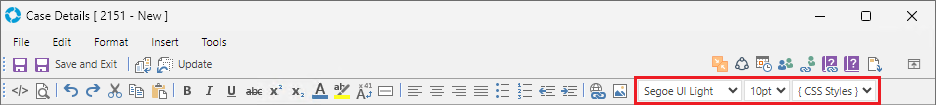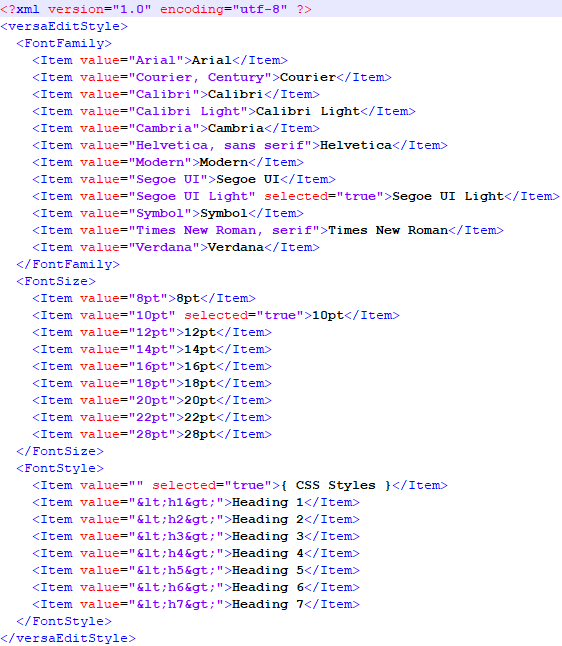 The versaEdit Text Editor that is used for formatting text on Records (Case/Problem/RFC/Task) can have its default Font styles changed by editing the versaEdit_Styles.xml file (pictured below).