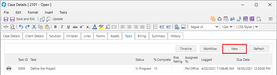 Unlike other Records (Case/Problem/RFC) in versaSRS Tasks cannot exist on their own and must belong to one of the other Records.