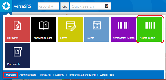 The versaAsset Import Tool can used to import a spreadsheet of Assets into versaSRS. The tool can be accessed by selecting the Assets Import icon from the versaSpinner - Manage tab.