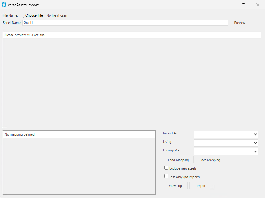 - You can use the Lookup Via field to detect the unique identifier for the Asset in the spreadsheet. For example if AssetID is selected then it will use the AssetID field in the spreadsheet for the comparison to the equivalent in versaSRS. If it finds a match then it will do an update rather than insert a new record. By default the Lookup Via field is set to No Lookup - Assume New Asset.