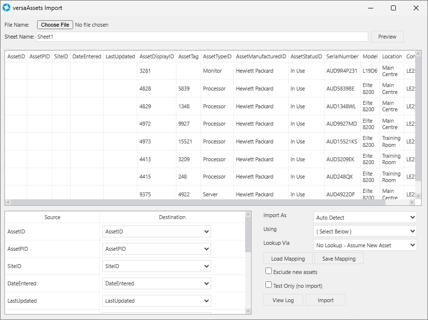 - In the Mapping section the Source will be populated with the fields from the spreadsheet. The Destination fields correspond to fields in the Asset module of versaSRS. You will need to select each of the fields in the Destination column to the correct mapping for each of the fields from the source.
