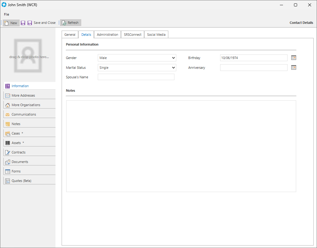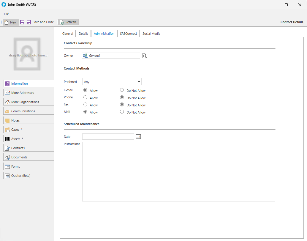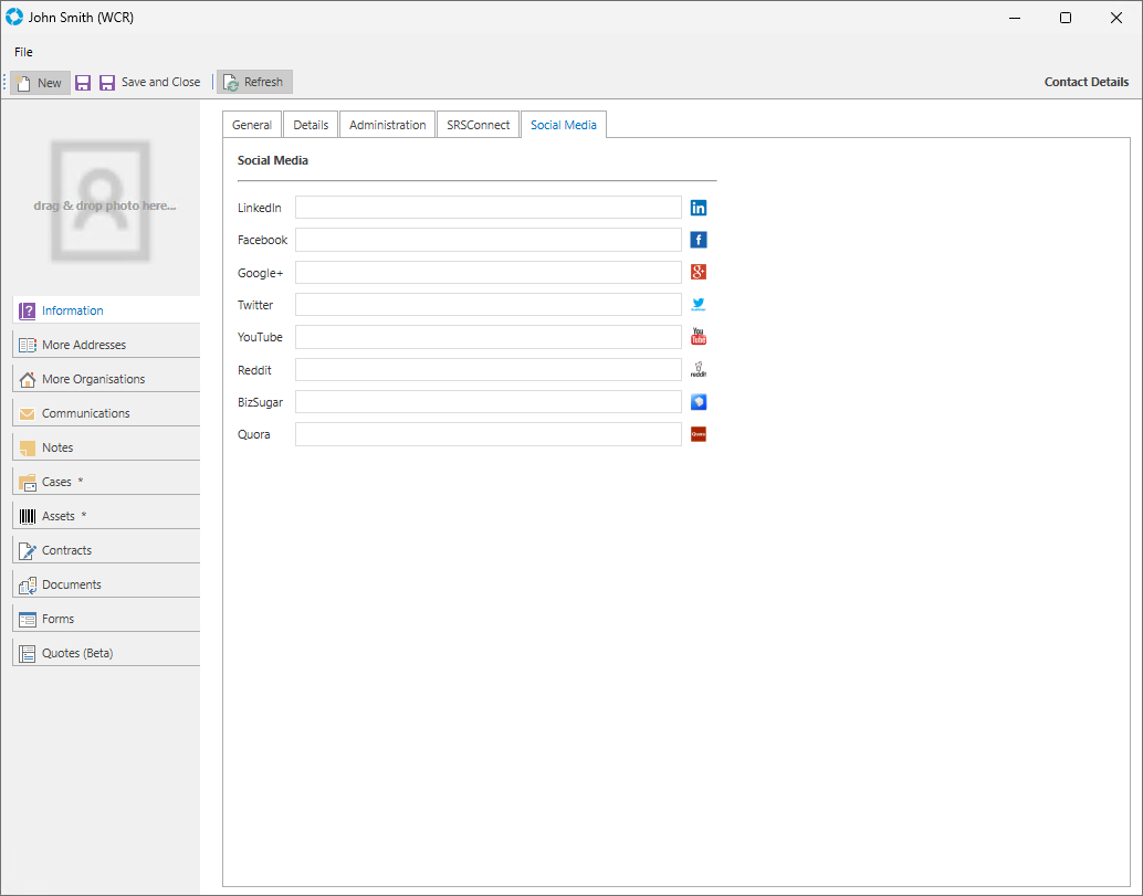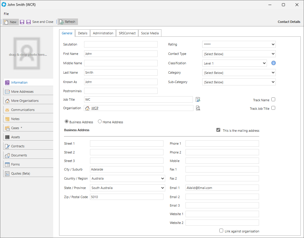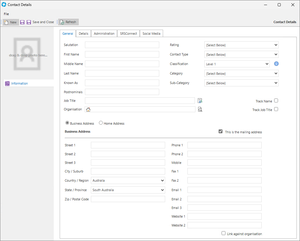 versaCRM Contacts are used to store numerous details about a Business Contact. The Contact's basic information is stored in the Information section, which includes five tabs: General, Details, Administration, SRSConnect, and Social Media. If required you can add Custom Tabs that allow for storing of additional data.