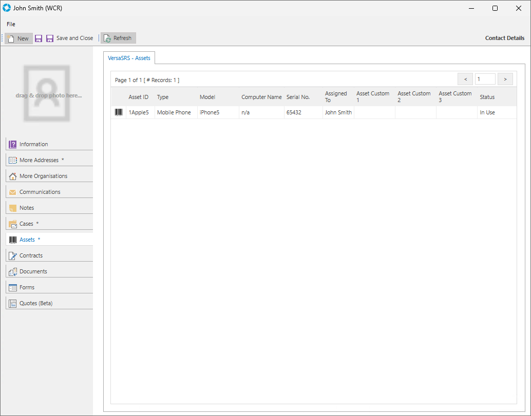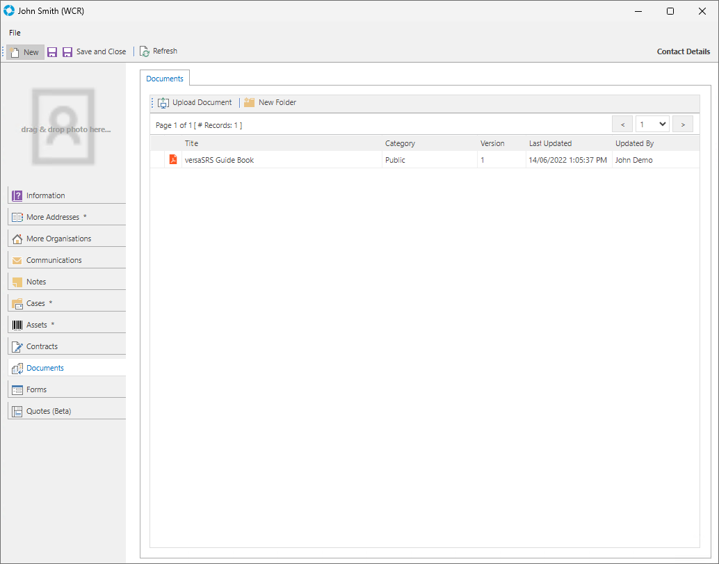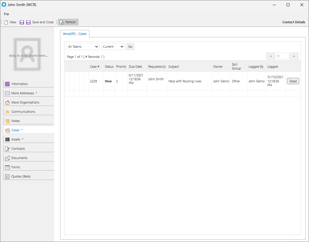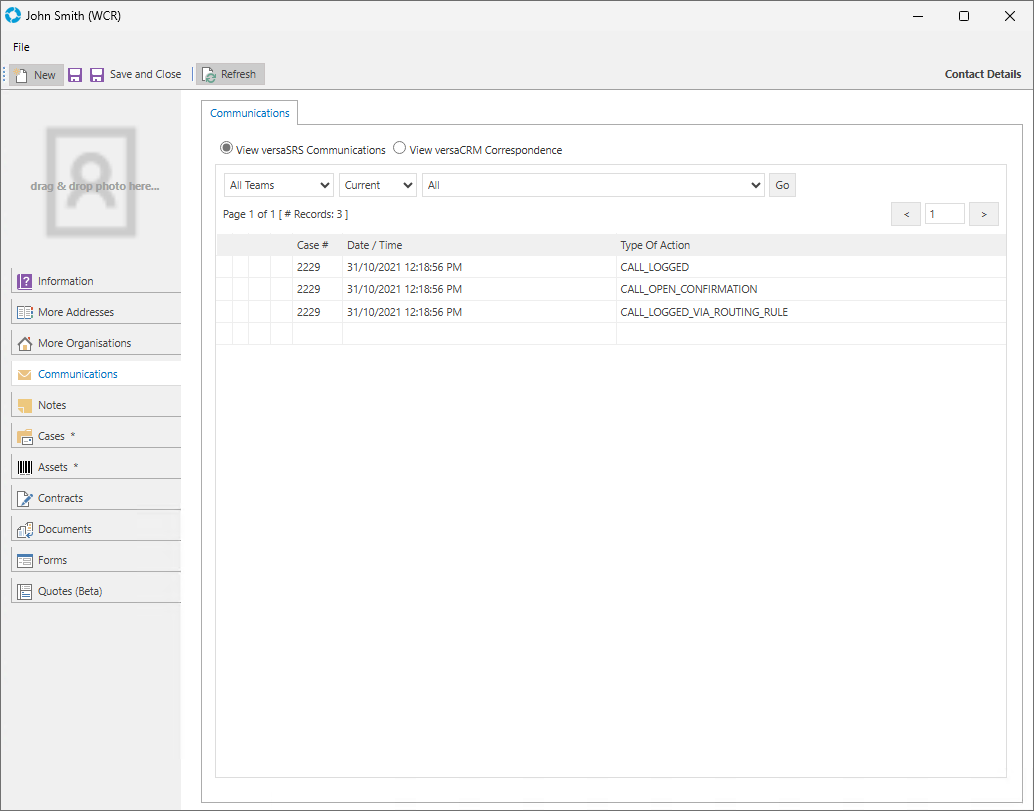 Here you can view the versaSRS and versaCRM Communications that relate to the Contact.