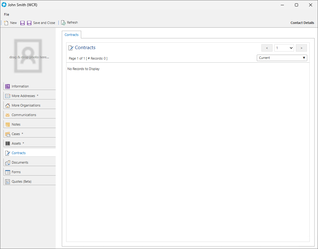 In the Contracts section you can view the existing Contracts for the Contact. To create a new Contract against the Contact select the 'New' icon (
