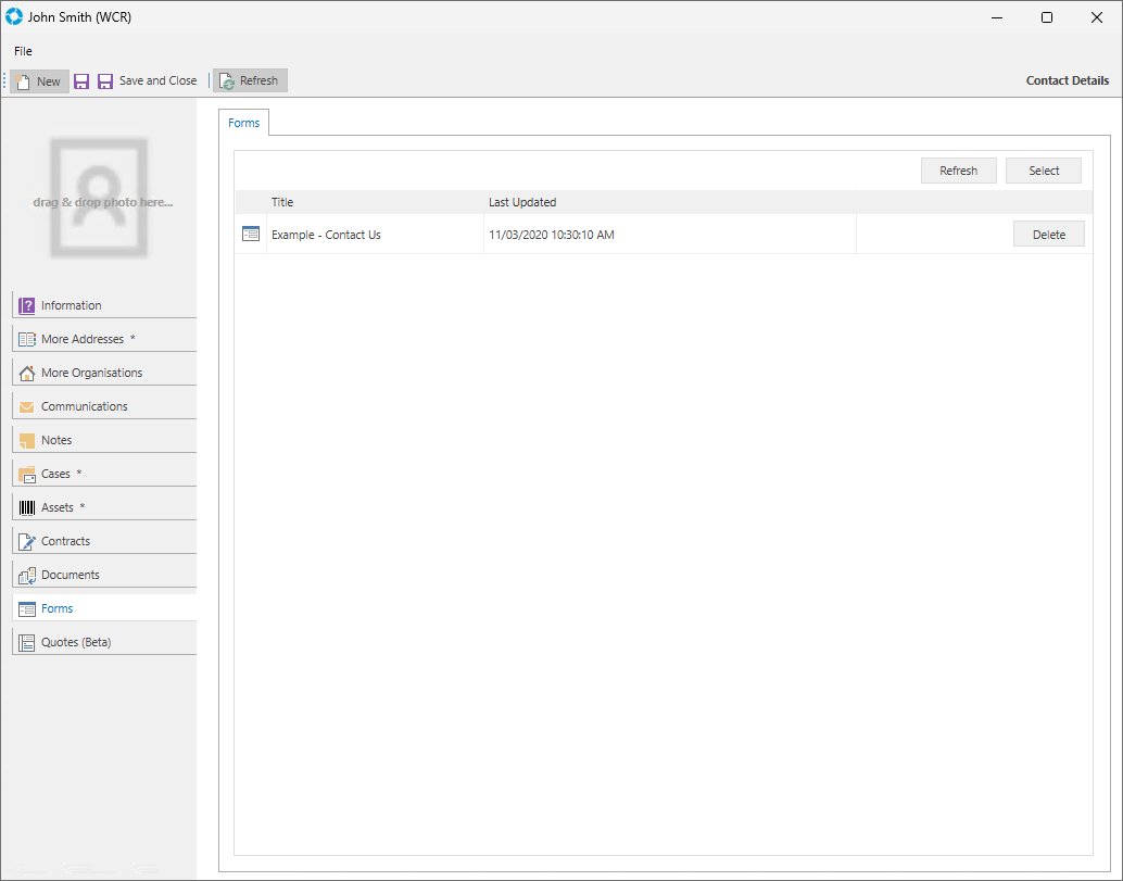 In the Forms section you can view versaForms that have been assigned to the Contact. To add a Form click the Select button near the top right corner.