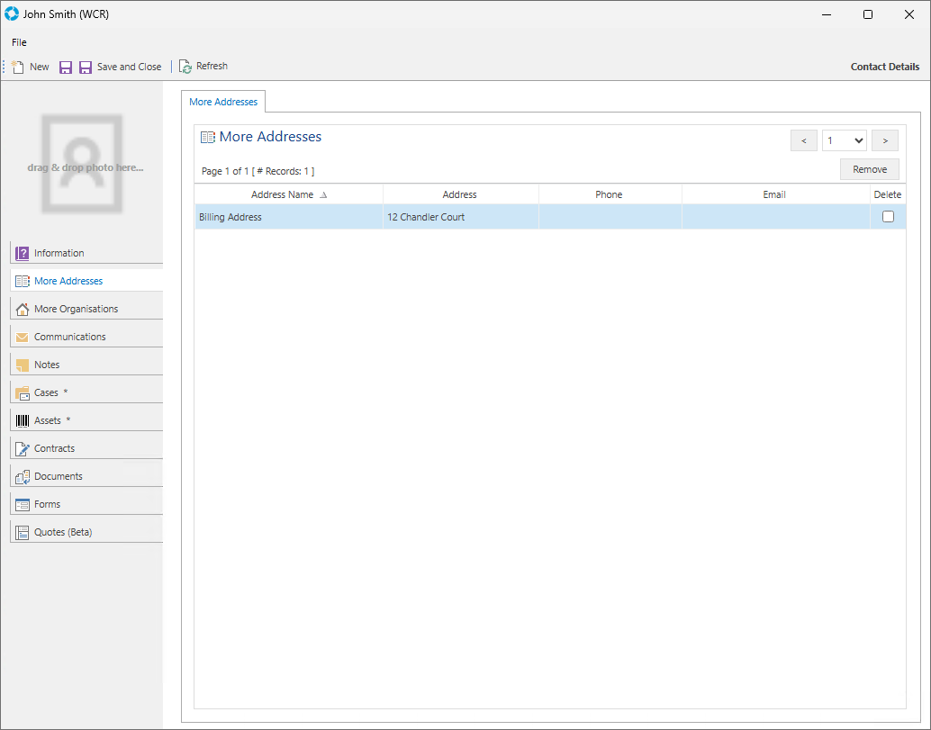 In the More Addresses section you can add multiple addresses to a Contact. To add a new address select the 'New' icon (