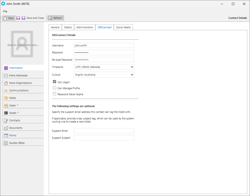 | Support Subject | Allows you to specify a Subject for any SRSConnect requests from this Contact; this can be used by the Routing Rules to control how the Case is logged. |