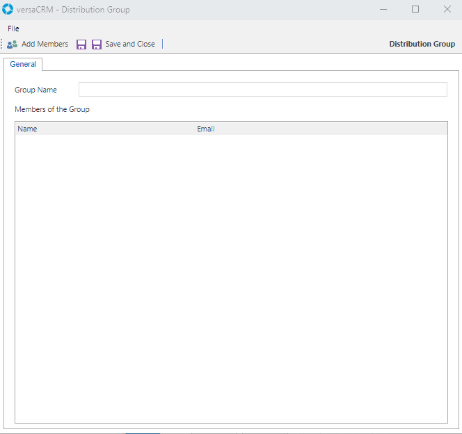 ) or Save and Close to save the created group. You will now be able to select the Distribution Group when sending out emails via versaSRS or versaCRM Correspondence.