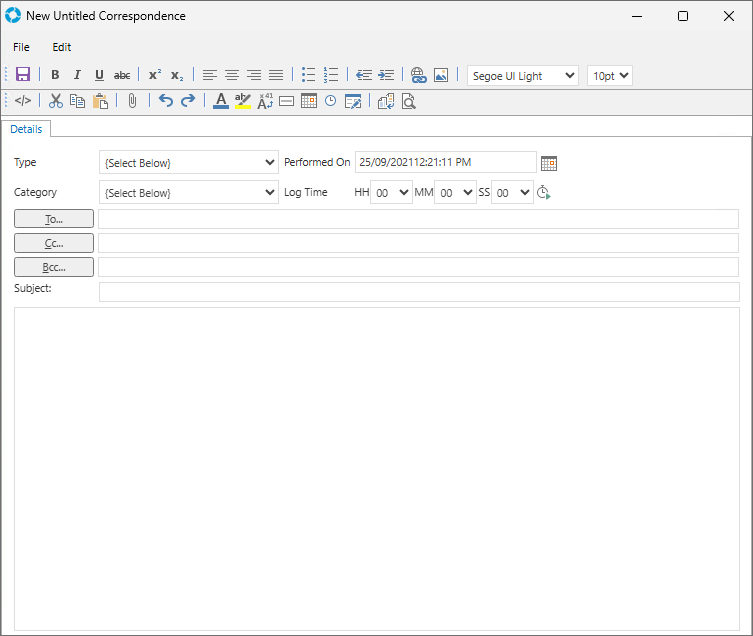 This will display the Correspondence window where the email can be constructed and sent. A Template can be applied by clicking on the Template icon (