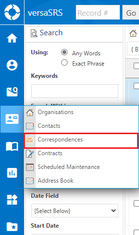 versaCRM Mail is accessed by clicking the Correspondences option under the My CRM icon on the Navigation Sidebar as shown below.