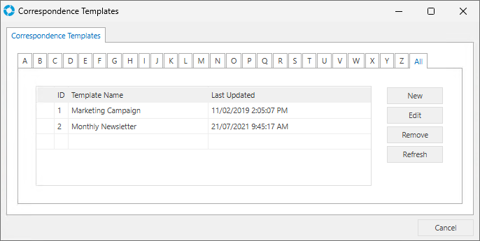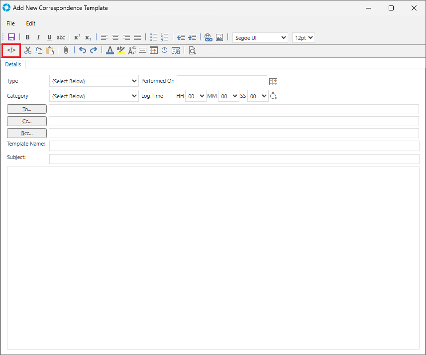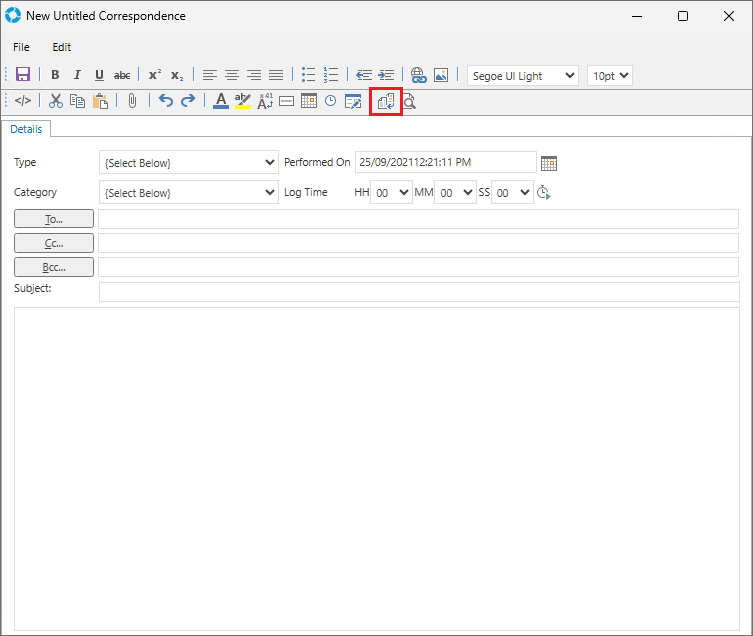 versaCRM Correspondence email Templates can be used to save pre-defined messages and formatting for outgoing CRM email.