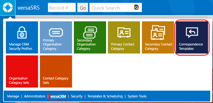 To manage the Templates select Correspondence Templates from the versaSpinner - versaCRM tab.