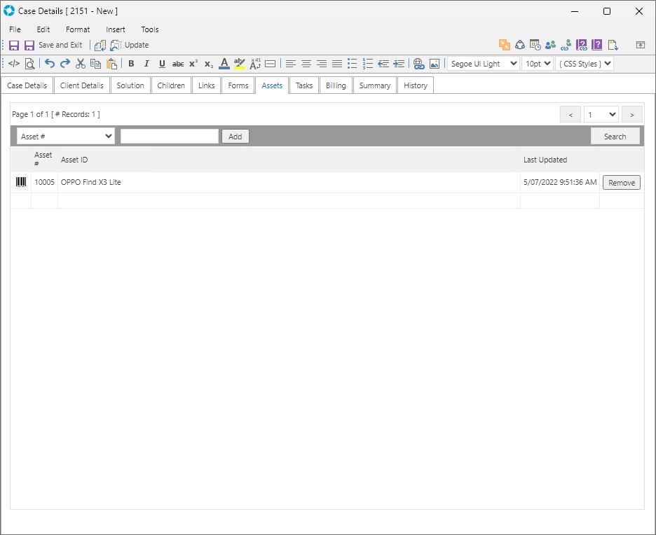 This tab allows the linking of an Asset to a Case as well as showing the current Assets that are already linked.