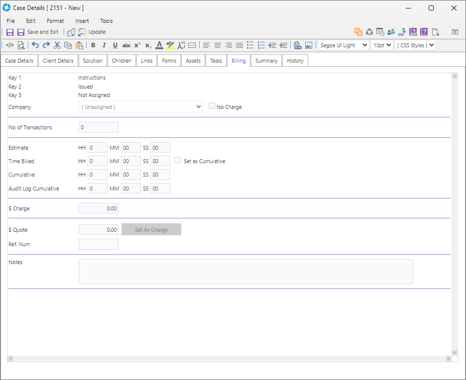 This tab allows Billing information to be entered. Billing information can only be edited when performing a Case Update.