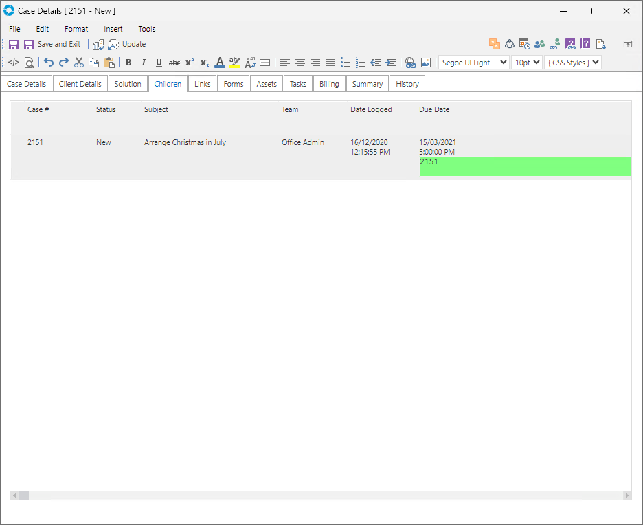 This tab contains the list of Cases which have been made a Child or Parent of the Case. You can create a Child Case directly from within an existing Case.