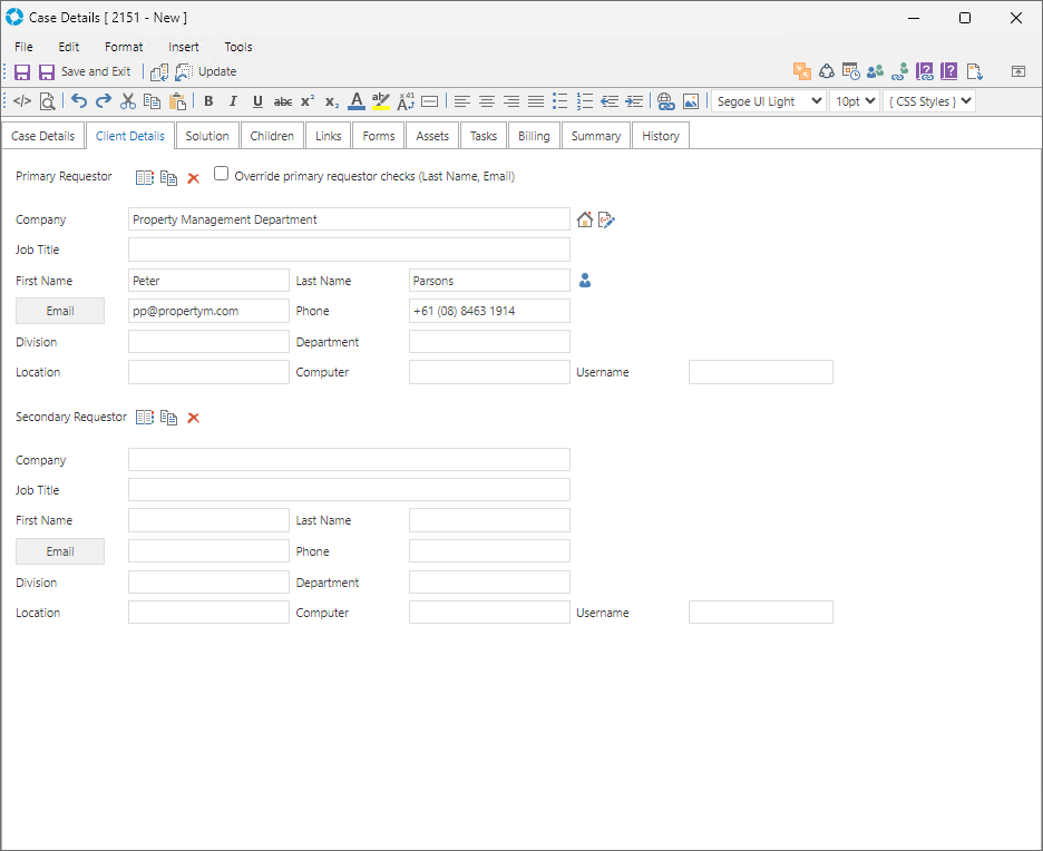 This tab contains the Client Details of the Primary and Secondary Requestors for the Case. These details can be selected from the versaCRM and all available fields auto-filled.