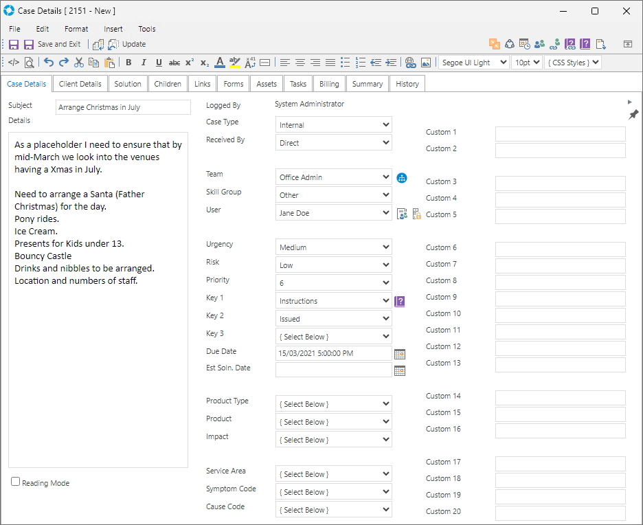 | Urgency | The Urgency of the Case, selected from the drop-down list. You can add or edit the available Urgencies via the System Tables drop-down option Urgency. |