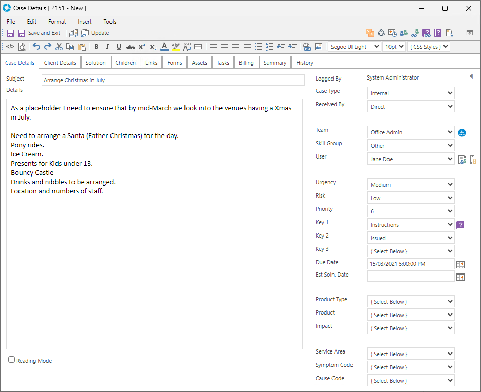 | Service Area | The Service Area to which the Case relates, selected from the available drop-down list options. You can add or edit the available Service Areas via the System Tables drop-down option Service Area. |