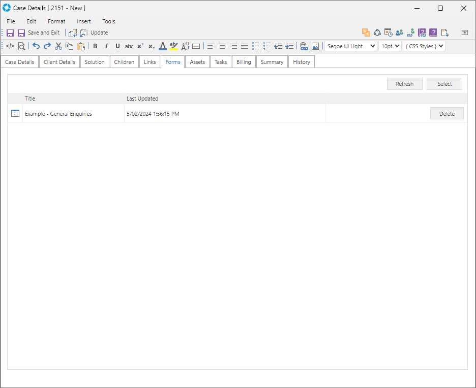 | Refresh button | Refreshes the page showing the most up to date display of the Forms within the Case |