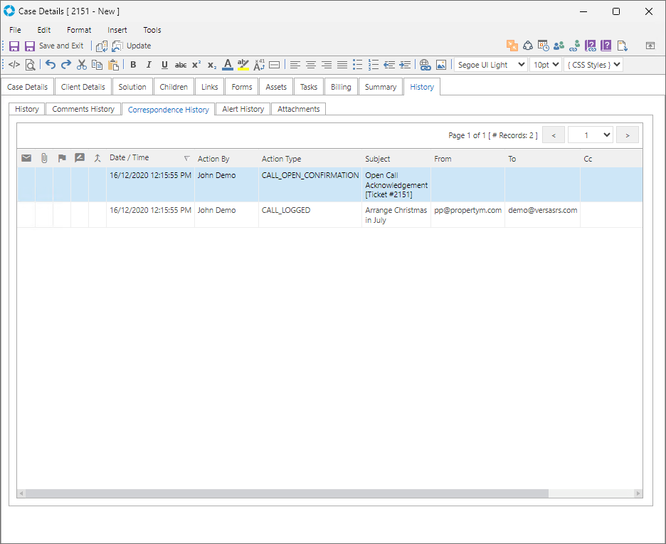 | Correspondence History | This tab shows the audit log history for Correspondence only |