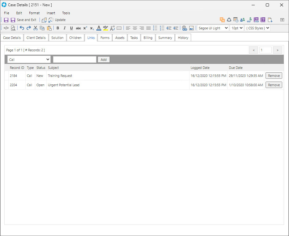 This tab allows the creation of a link between Cases, Problems, and RFC's as well as showing the current links already established.