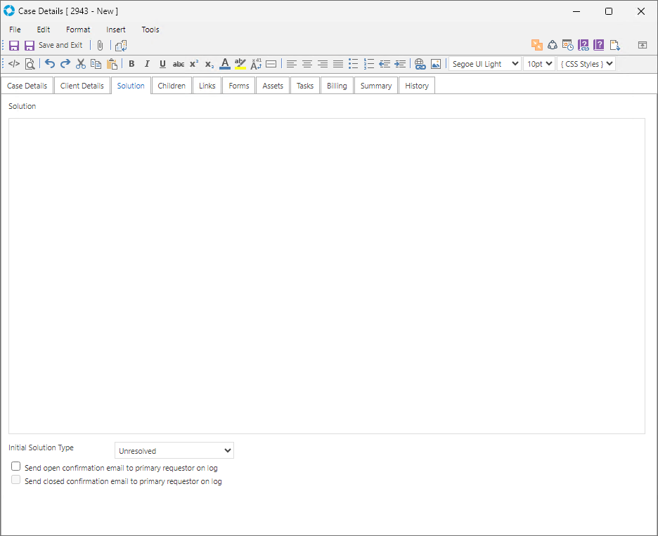 | Send closed confirmation checkbox | Checking this will cause the Closed Confirmation email (set in the Team Settings) to be sent when the Case is logged/closed. Only applies when creating new Cases manually and the Initial Solution Type is set to Resolved. |