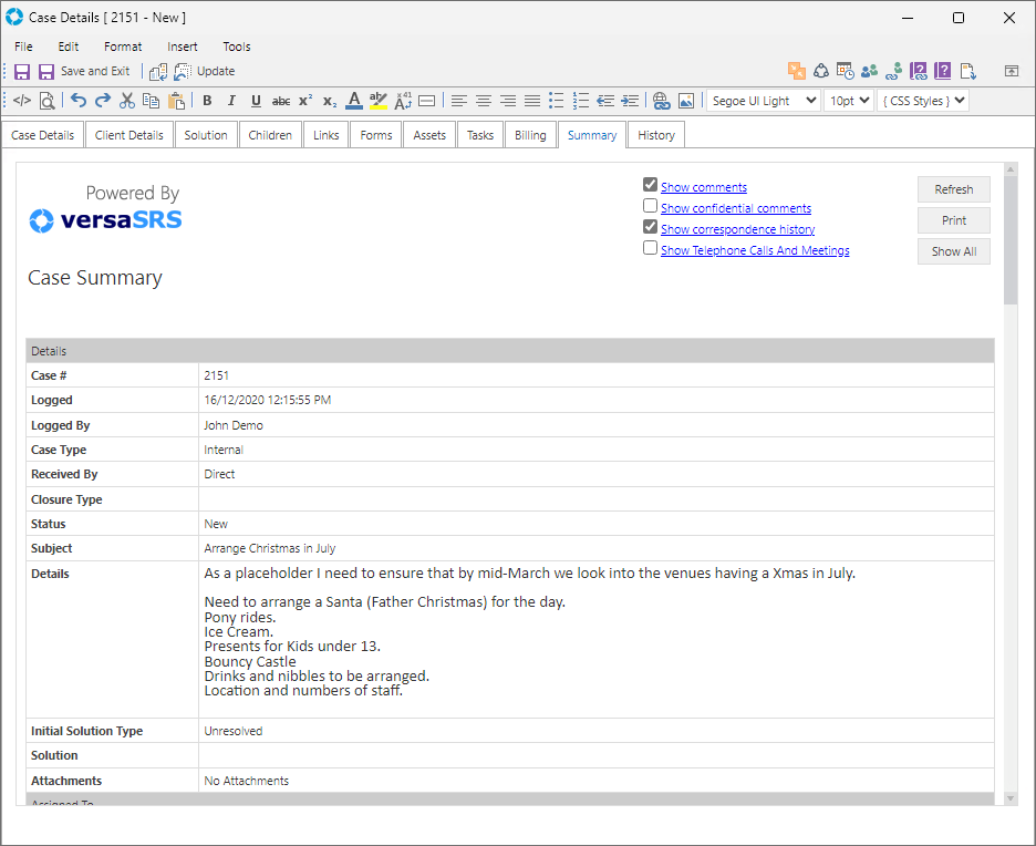 This tab shows the Printer Friendly view and is a summary of the main details and correspondence for the Case.