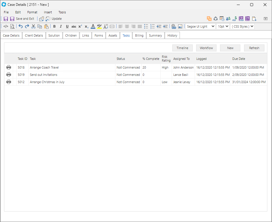 | Timeline button | Clicking this will display a timeline of the Tasks against the Case |