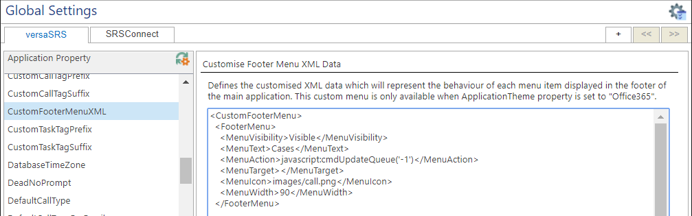 Each footer menu link is defined by the <FooterMenu> xml block, as shown in the above image. The default menu options link to Views within versaSRS, however custom links can be added to external sites as well.
