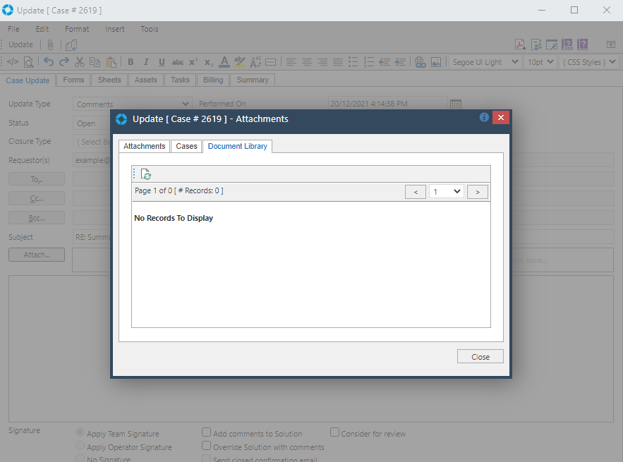Documents can be added to Updates as attachments by selecting the Attachment button and then clicking the Documents Library tab.