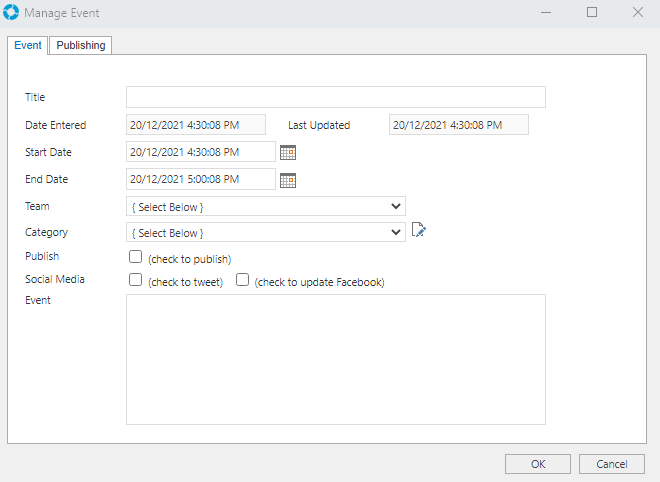 When creating new or editing existing Events, the Manage Events screen is displayed which consists of two tabs labelled 'Event' and 'Publishing'.
