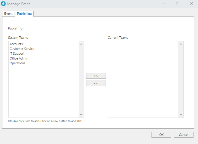 The Publishing tab allows publishing of Events to specific Teams. Double clicking one of the Teams in the System Teams list will add the Team to the Current Teams list. You must add at least one Team to the Current Teams list to save the Event.