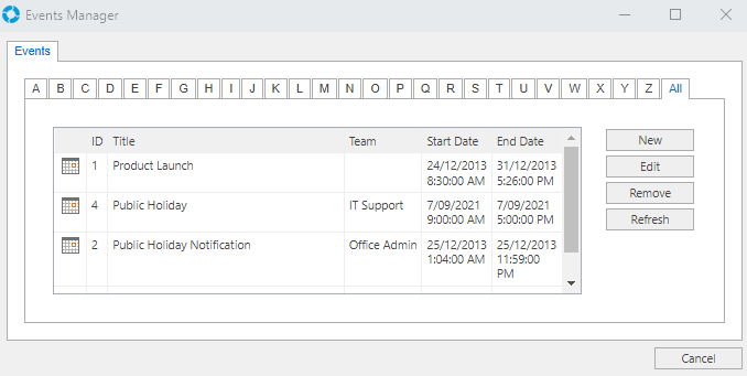 This will display the Manage Events screen where entries can be added, edited and deleted.