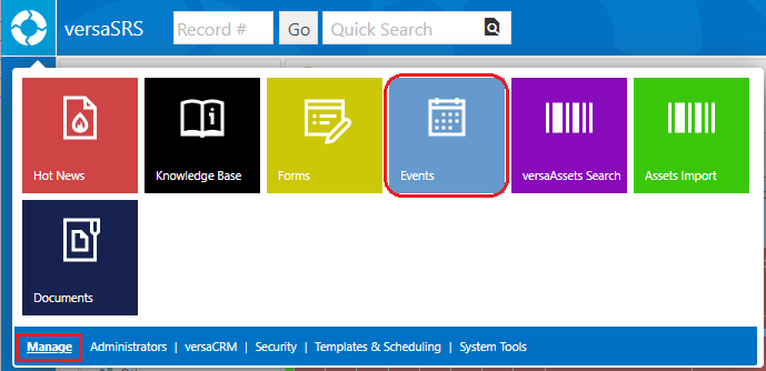 To manage the Events select the Manage Events icon from the versaSpinner - Manage tab.