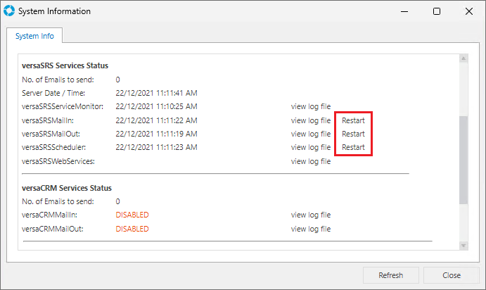 If a restart of any Service(s) is required then this can be done from within versaSRS by clicking the 'Restart' link next to the 'view log file' link in the System Info window (Settings cog >> System Info). Alternatively, they can be restarted from within the Windows Services panel on the server.