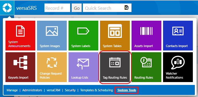 Tag Routing Rules can be managed by selecting the Tag Routing Rules icon from the versaSpinner - System Tools tab. In order to use Tag Routing Rules ensure the Global Settings Application Property EnableTagRoutingRules is set to Enabled.