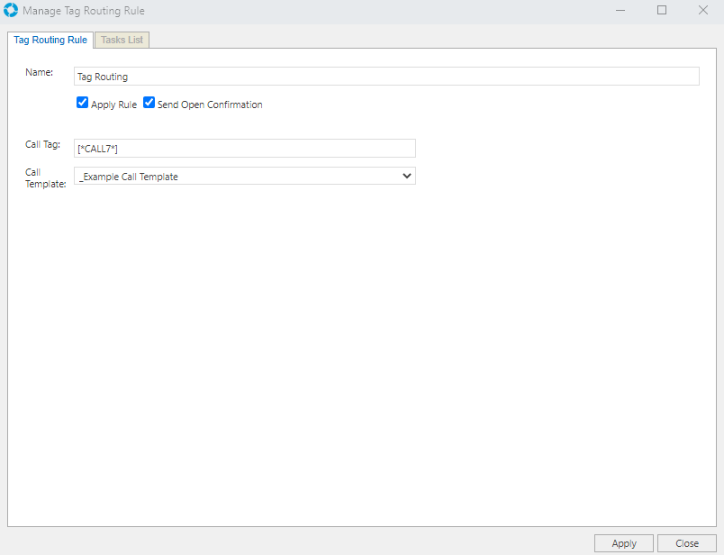 To create a new Tag Routing Rule click the New button and enter an appropriate name within the Name field on the Manage Tag Routing Rule page. Ensure the Apply Rule checkbox is ticked to make the Rule active in versaSRS. The Tag that will be used to trigger the Case creation is defined in the Call Tag field.