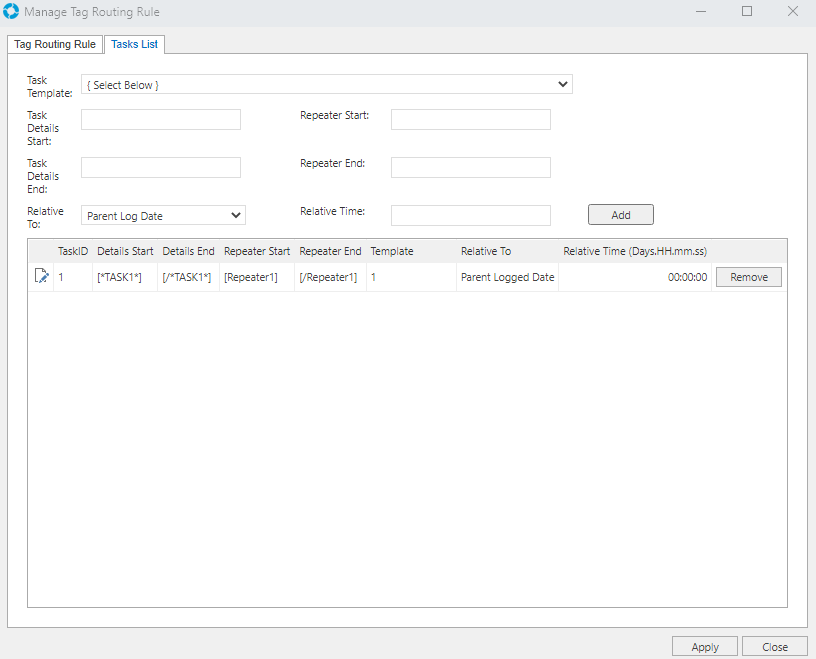 Under the Tasks List tab the Task Tags are defined. In order to successfully create the required Task(s) a Task Template needs to be selected and the Task Details Start and Task Details End Tags must be defined. The Task Template that is selected must contain the [TASK_TAG_DETAILS] and [TASK_TAG_REPEATER] System Tags for the Task Details and Repeater text to display as expected.