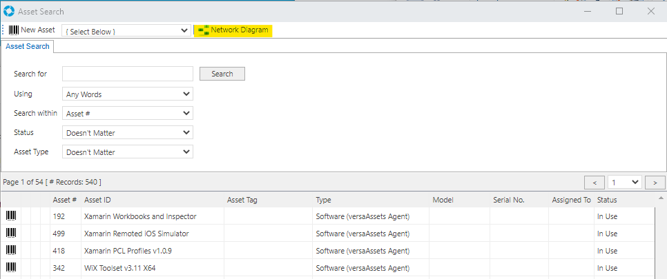 The Asset diagram can be viewed by selecting the Asset icon from the tool bar and clicking the 'Network Diagram' button.