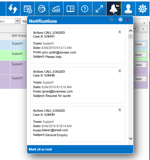 Clicking on the icon will expand the Notifications window where each Notification message can be clicked to view the Record (Case/Problem/RFC/Task) that they relate to or can be cancelled.