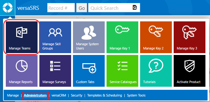 The Open Confirmation Template is managed in the Team Settings. To Manage Teams in versaSRS select the Manage Teams icon from the versaSpinner - Administrators tab.