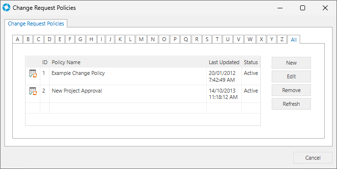 This will open the Change Request Policies window where RFC Policies can be created, edited, and deleted.