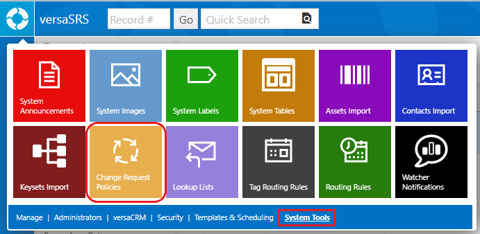To Manage the RFC Policies select the Change Request Policies icon from the versaSpinner - System Tools tab.