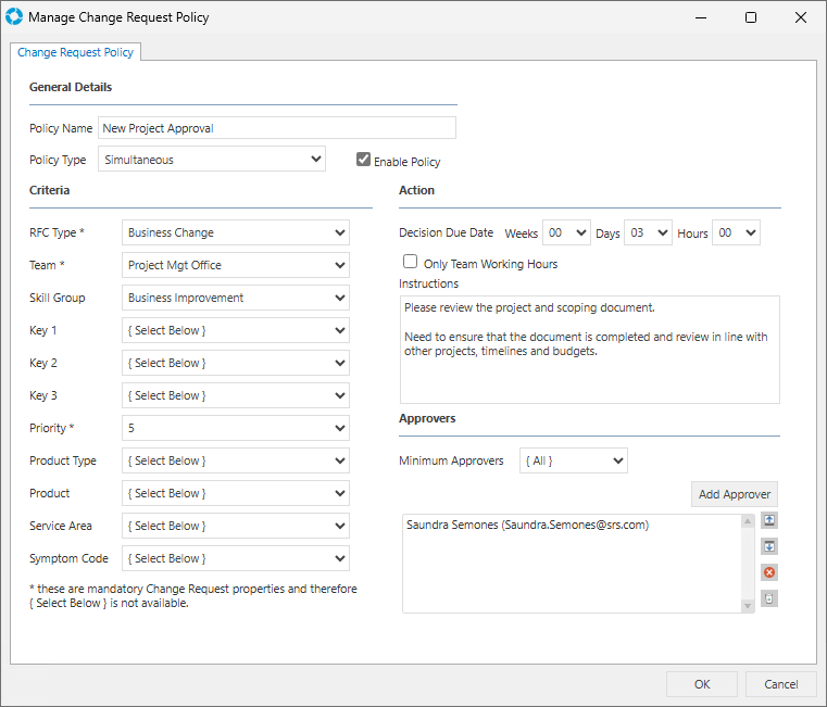 When creating new or editing existing Policies, the Manage Change Request Policy window is displayed.