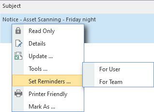 Reminder messages can be set for a Record (Case, Problem, RFC, or Task) that will notify a specific User or the entire Team. To set a Reminder, right-click on a Record listing and select Set Reminders ... >> 'For User' or 'For Team'.