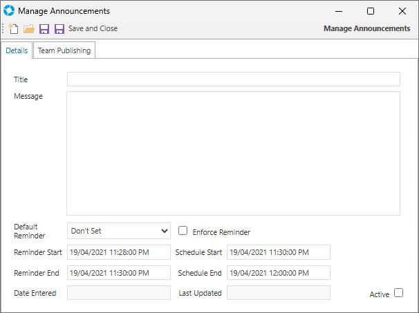 This will open the Manage Announcements/Manage Messages window where the Reminder details can be entered as well as the start/end dates for the Reminder notification and publishing options.