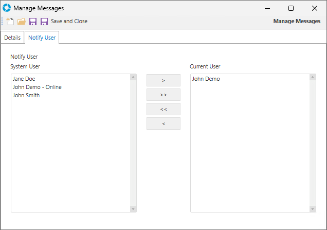 The For User Reminder window is shown below, the Notify User tab contains a list of the System Users that can be notified about the Record. To have the Reminder display for a given User move their name to the Current User list by double-clicking a System User or selecting the System User then pressing the > button.