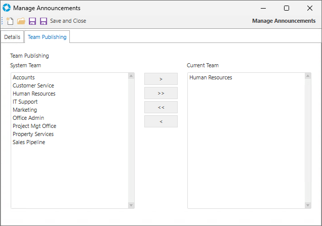 The For Team Reminder window is shown below, the Team Publishing tab contains a list of the System Teams that will display the Reminder. To have the Reminder display for a given Team move the Team to the Current Team list by double-clicking a System Team or selecting the System Team then pressing the > button.