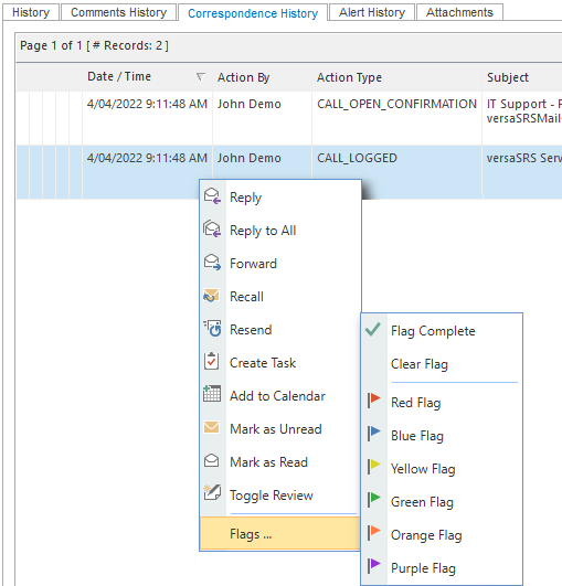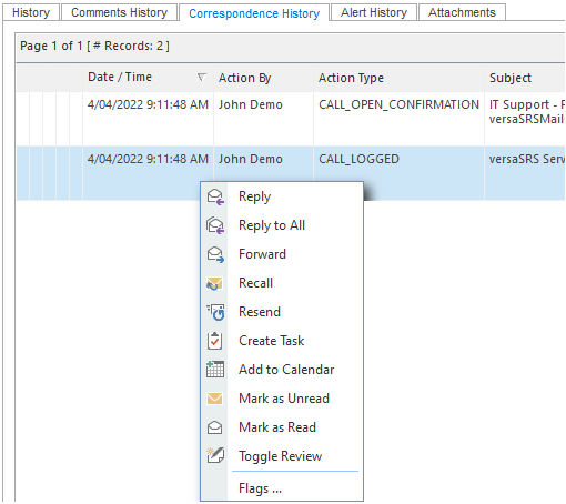 Right-Click Menus are available for quick access to tools and actions for versaSRS Records (Case, Problem, RFC, or Task) and versaCRM Records (Contacts/Organisations) .